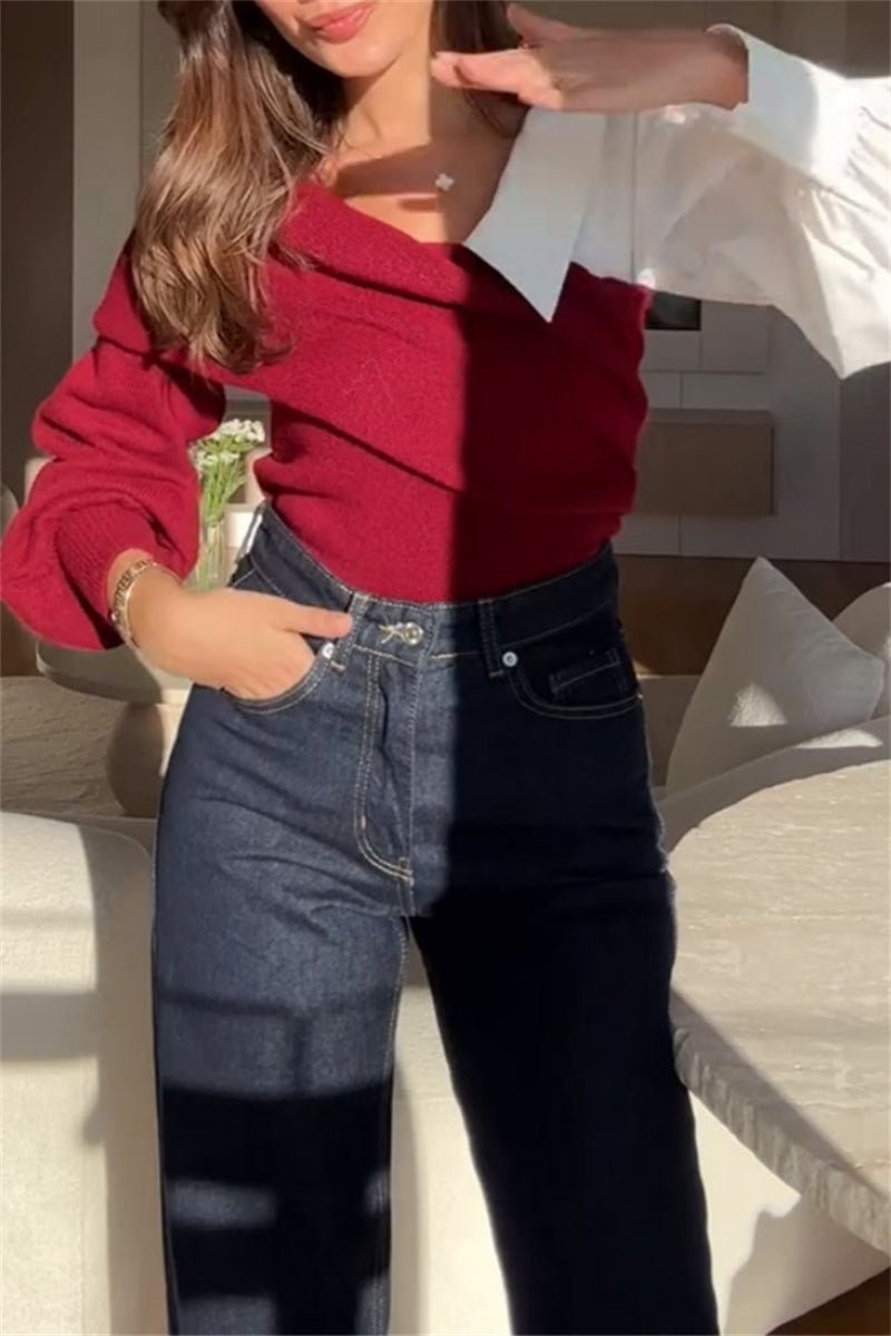 Casual Patchwork Contrast V Neck Sweaters