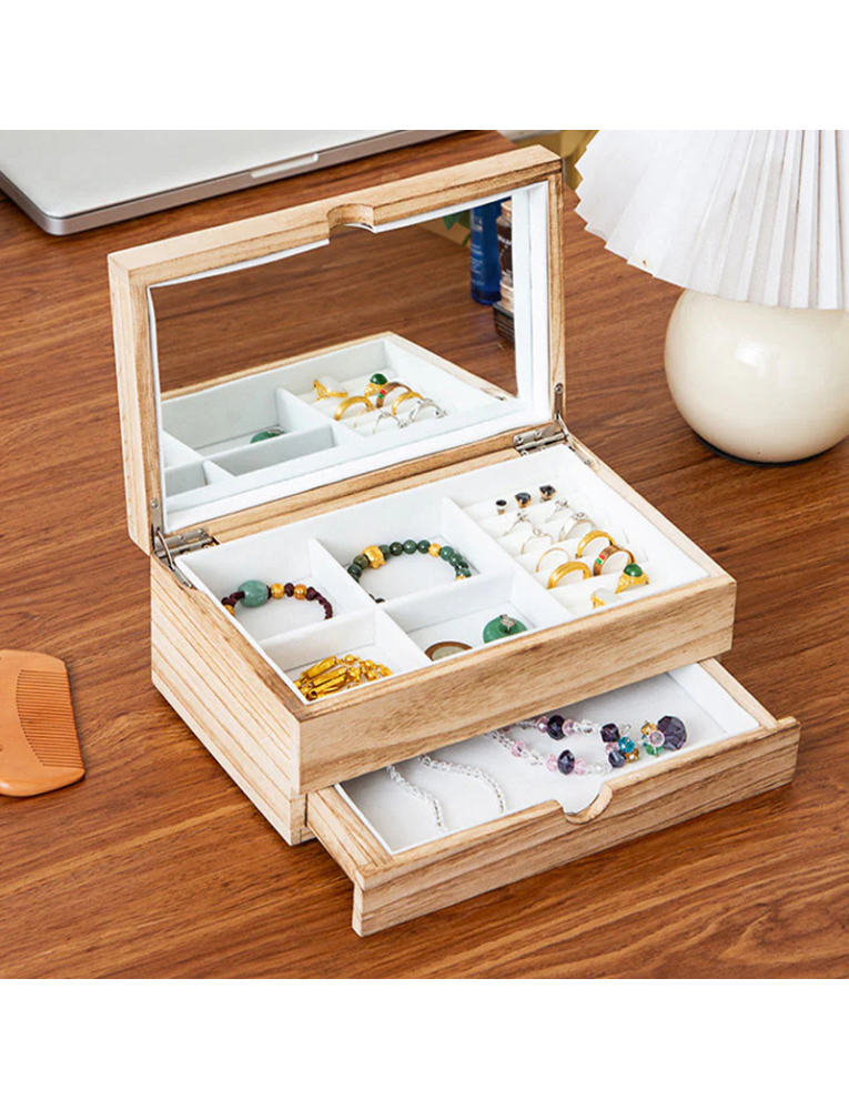 Retro Beige Wooden Jewelry Box Two-Layer Jewelry Storage Box With Mirror